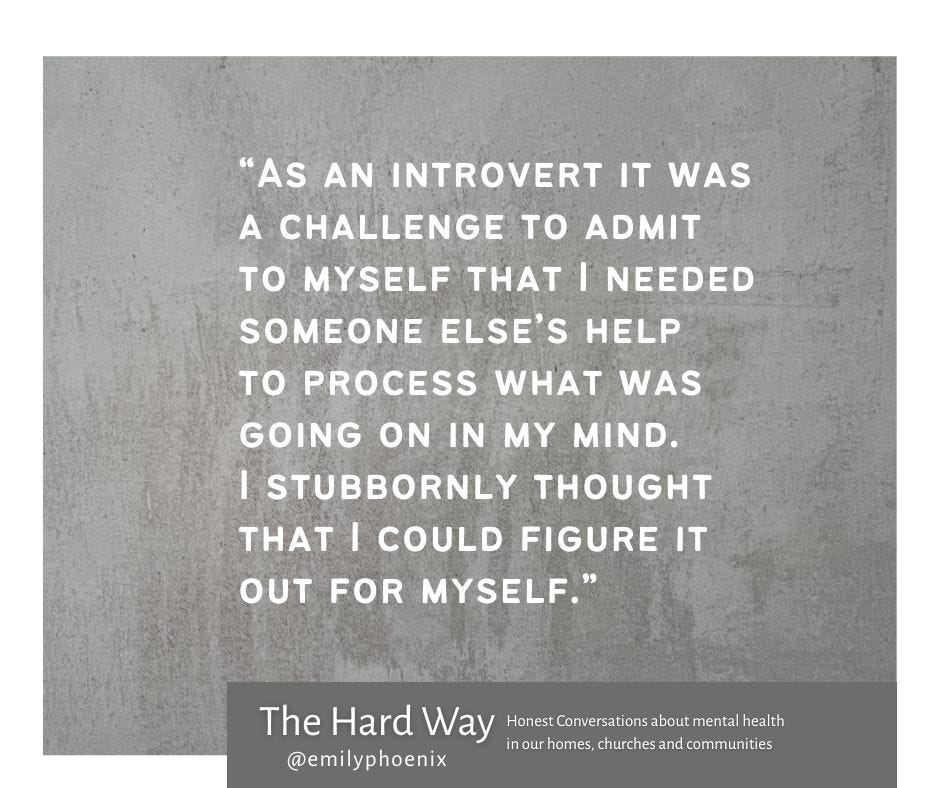 As an introvert it was a challenge to admit to myself that I needed someone else’s help to process what was going on in my mind. I stubbornly thought that I could figure it out for myself.